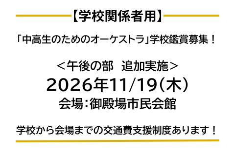 - 2025.12.25 支援・募集 【学校関係者用】令和8年度「中高生のためのオーケストラ」学校鑑賞募集!<午後の部追加実施>(会場:御殿場市民会館)