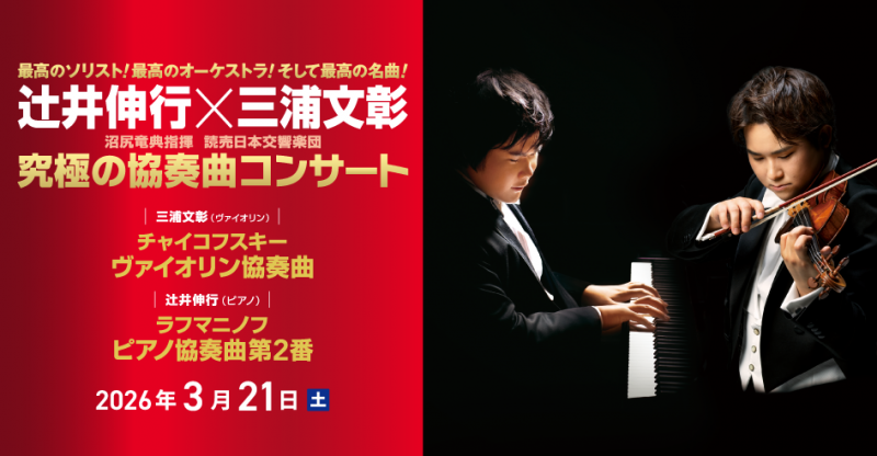 更新日:2026年3月21日(土) 公演・イベント 3/21 辻井伸行×三浦文彰 「究極の協奏曲コンサート」アンコール曲 ポスト シェア LINEで送る 辻井伸行×三浦文彰 「究極の協奏曲コンサート」沼尻竜典指揮 読売日本交響楽団アンコール曲服部隆之:「真田丸」メインテーマヴィットーリオ・モンティ:チャルダッシュピアノ:辻井伸行ヴァイオリン:三浦文彰本日はグランシップへのご来場、まことにありがとうございました。